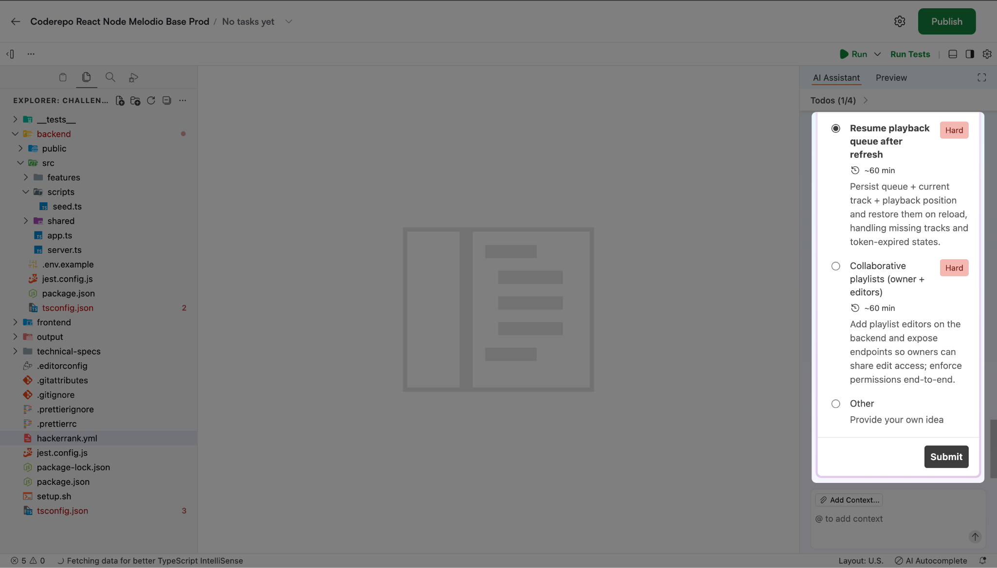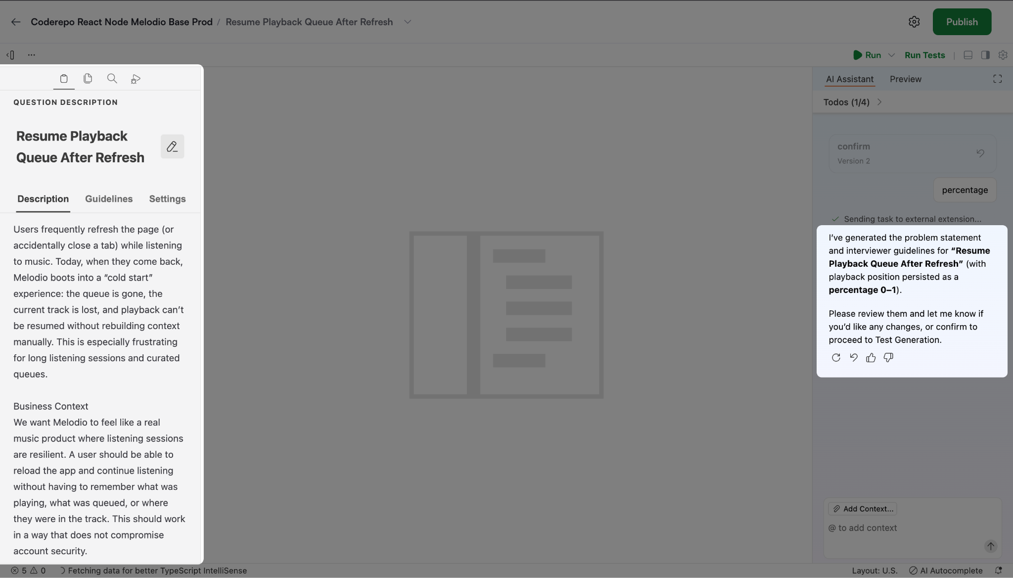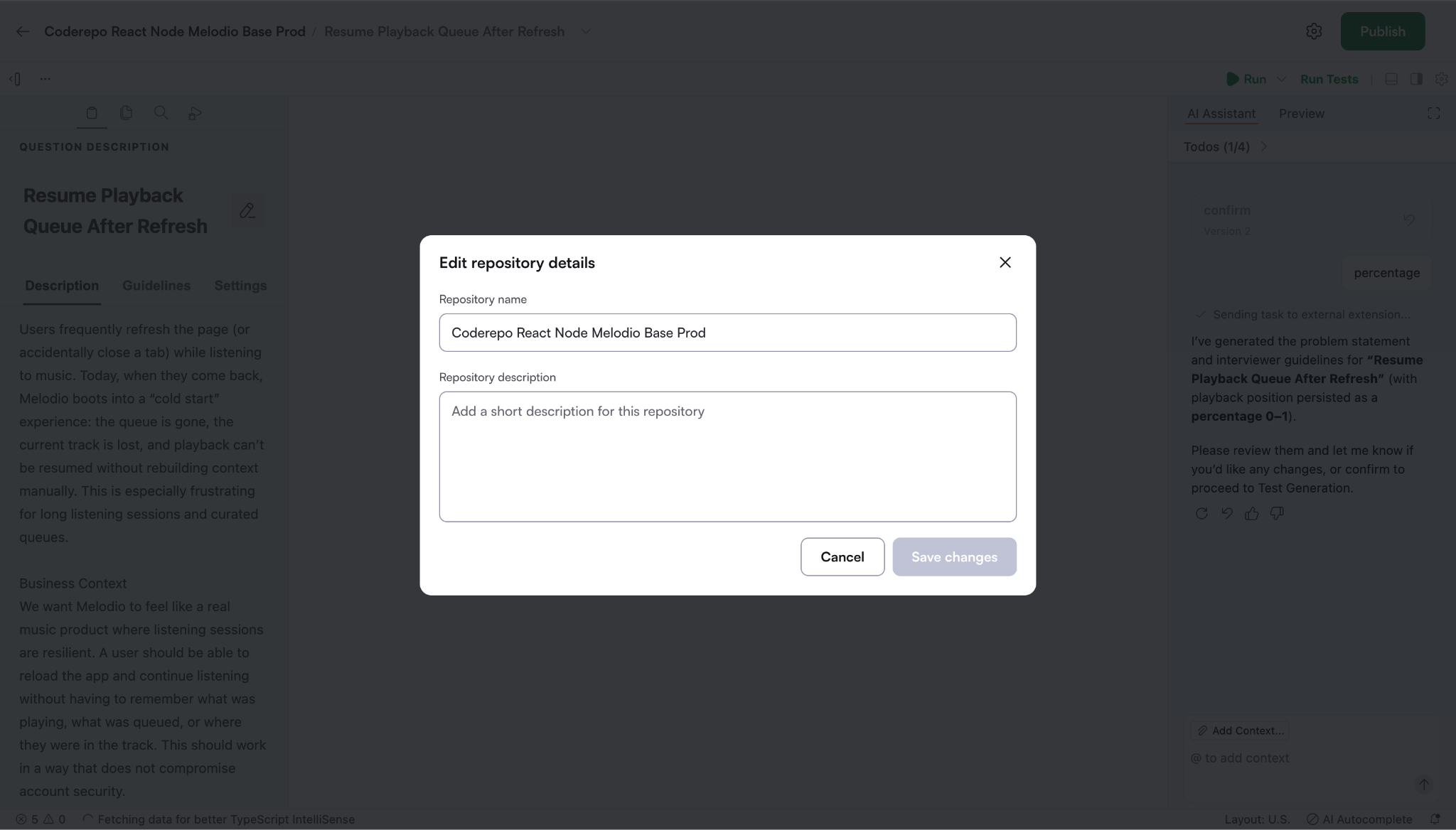 Code Repository lets you create multiple questions from a single repository. Each question can assess a different objective, such as fixing a bug, building a feature, or working on a specific part of the application, while reusing the same base setup.